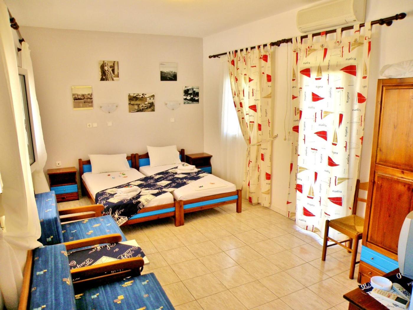 Studio. Opening to 2 balconies with Aegean Sea and mountain views, this air-conditioned studio features a TV and a kitchenette with a fridge.